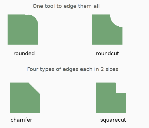 This versatile edging tool gives you 4 types of edges each in 2 different sizes. The smaller version will create a tiny edge about 2 mm, while the larger version is aiming for about 4mm.