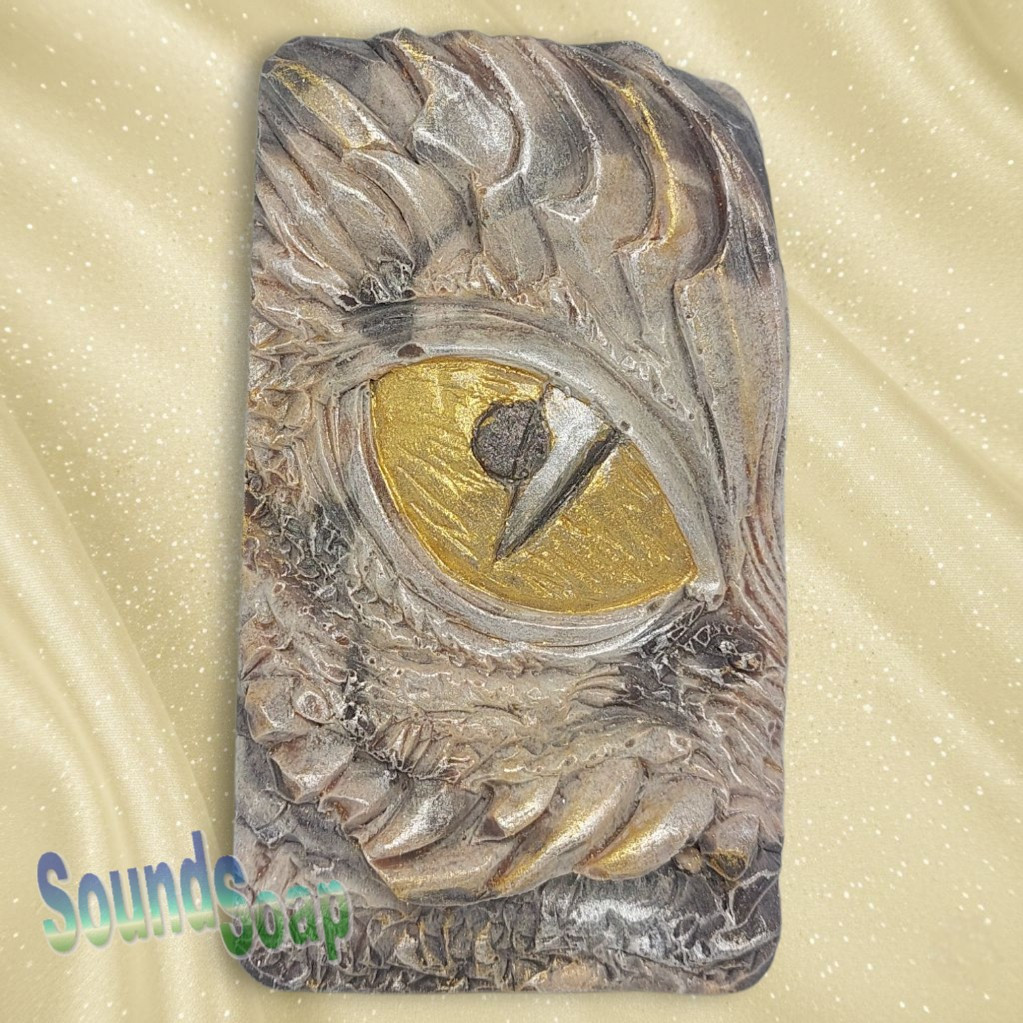 An artisan soap bar featuring a prehistoric Dinosaur Eye design with a golden iris and heavy, weathered stone-effect lids.