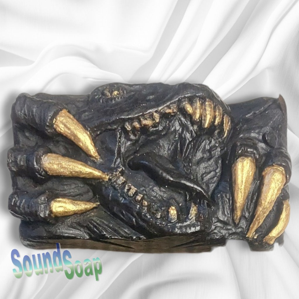 Same as the Pine Tar Soap, but made in the T-Rex mould and decorated with a bit of gold mica.