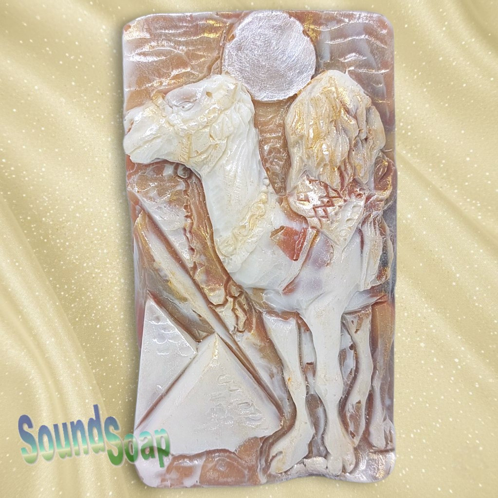 A scenic artisan soap bar featuring a prominent desert camel set against pyramid silhouettes.