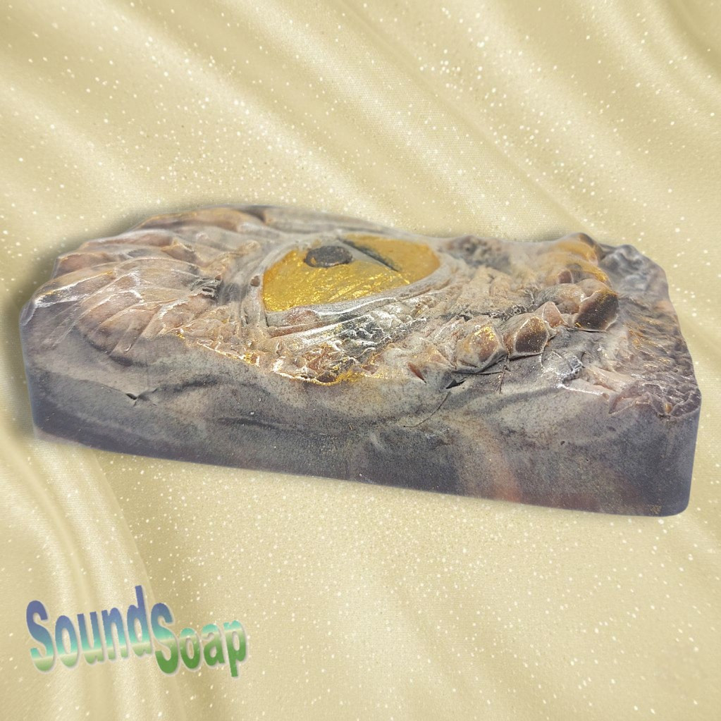 An artisan soap bar featuring a prehistoric Dinosaur Eye design with a golden iris and heavy, weathered stone-effect lids.